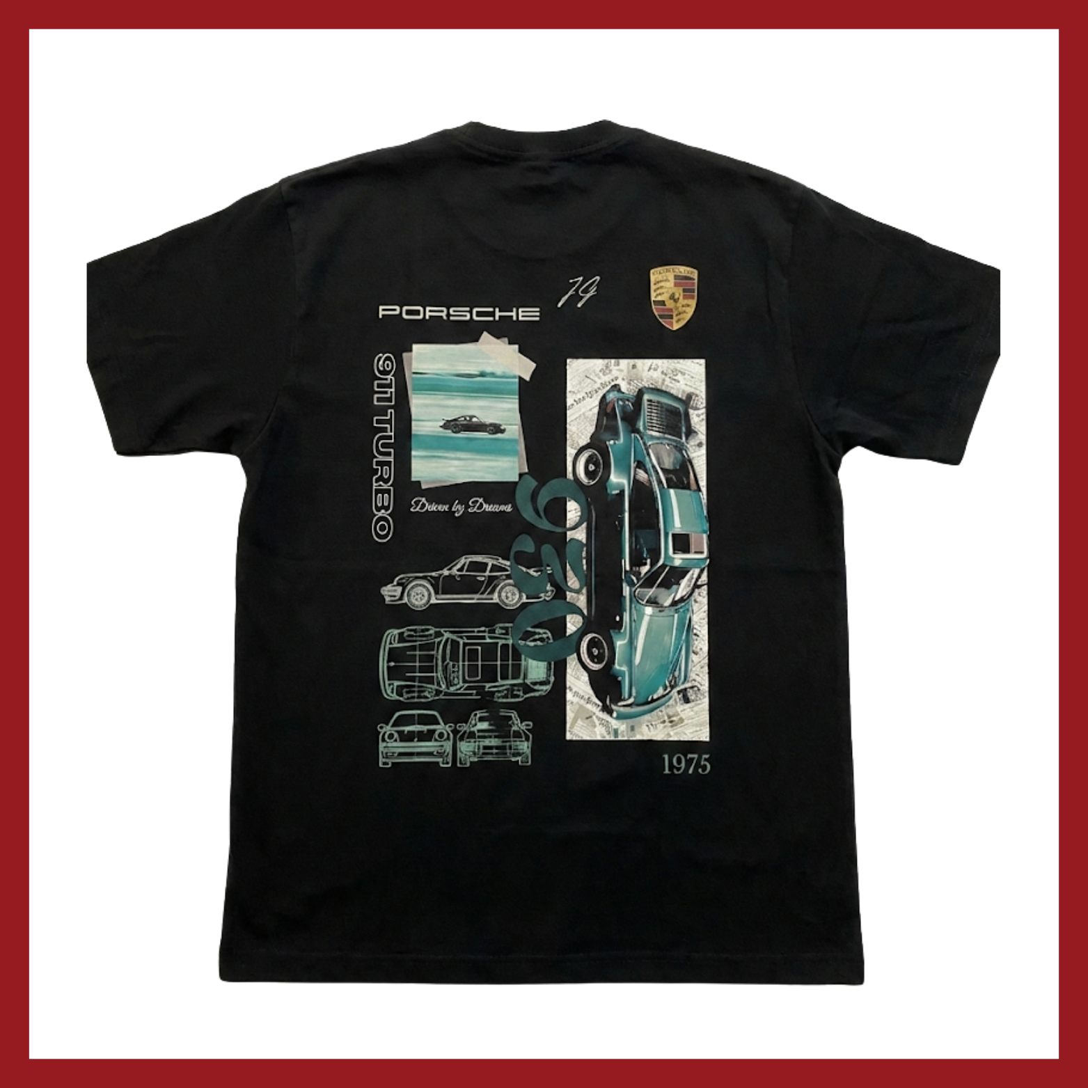 Celebre o início de uma lenda com esta camiseta dedicada ao Porsche 911 Turbo (Geração 930), lançado em 1975. A estampa traz uma composição sofisticada estilo collage, destacando o modelo na icônica cor verde metálico, misturando fotografia, desenhos técnicos e recortes de jornal que contam a história deste ícone.