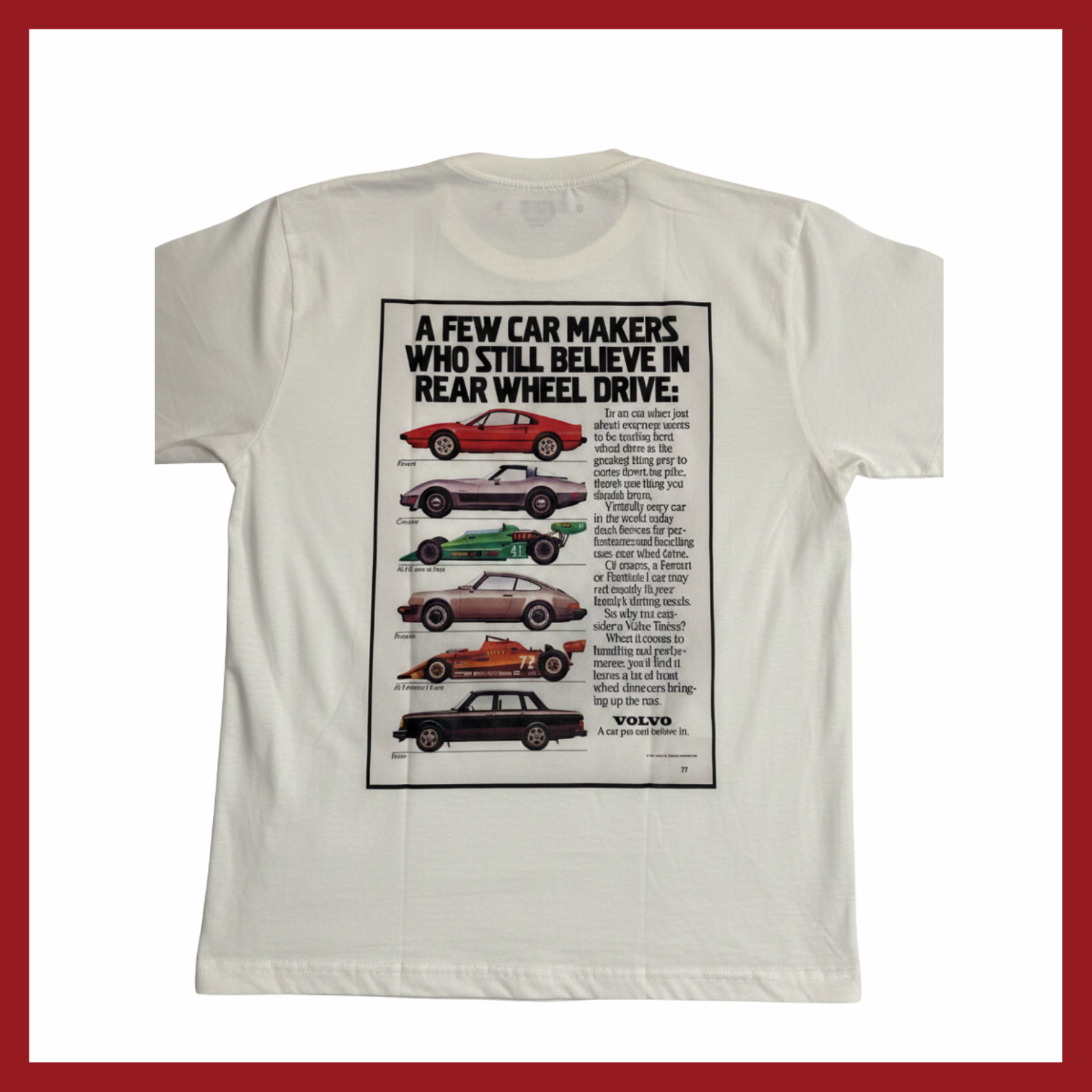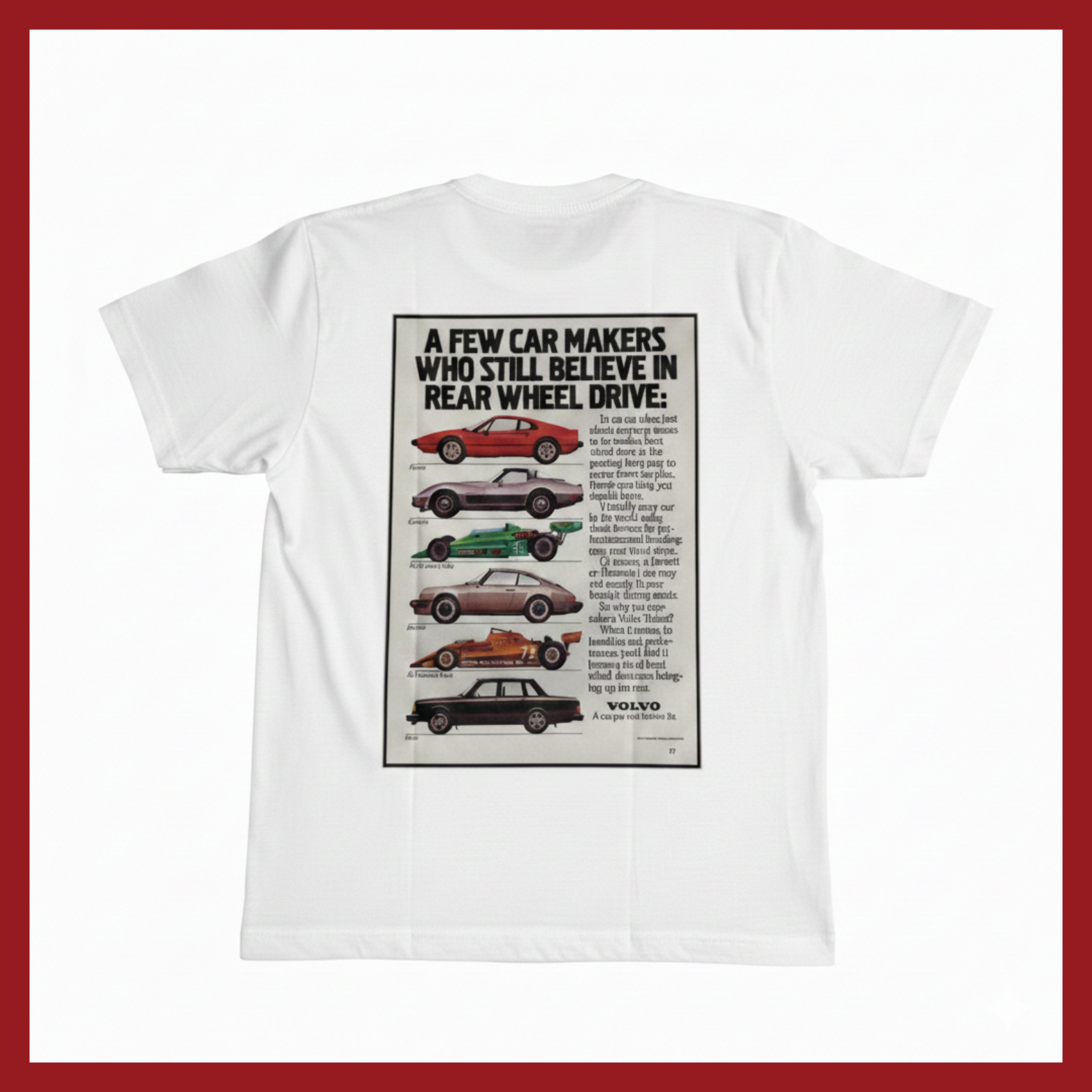 Uma homenagem aos poucos fabricantes que mantiveram a tradição da tração traseira viva. Esta camiseta estampa uma propaganda clássica que coloca a Volvo ao lado de gigantes como Ferrari, Porsche e Corvette, destacando o DNA de performance e dirigibilidade que entusiastas do mundo inteiro respeitam.